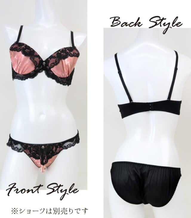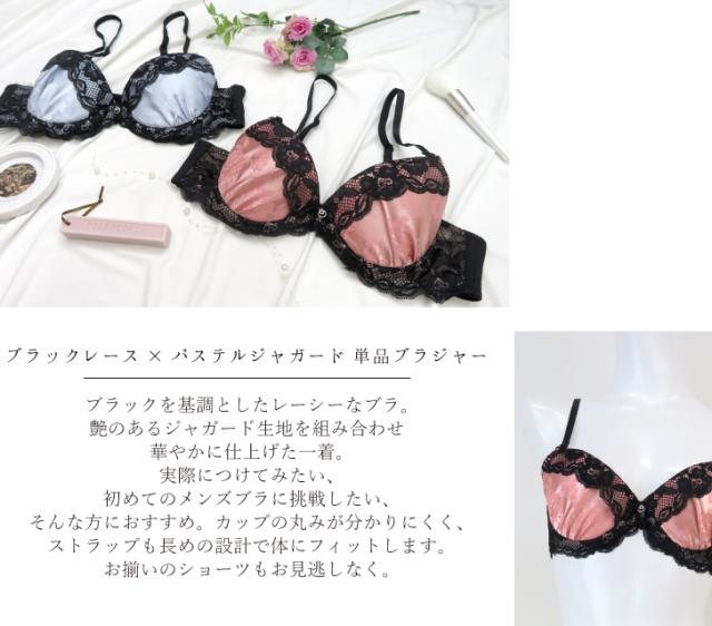 ブラックを基調としたレーシーなブラ。艶のあるジャガード生地を組み合わせ華やかに仕上げた一着。実際につけてみたい、初めてのメンズブラに挑戦したい、そんな方におすすめ。カップの丸みが分かりにくく、ストラップも長めの設計で体にフィットします。お揃いのショーツもお見逃しなく。