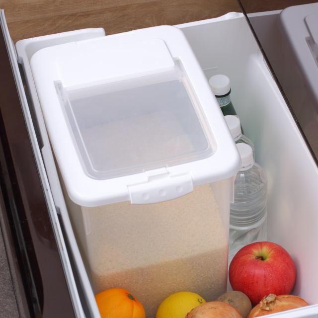 大容量なのにシステムキッチンの引き出しやシンク下、冷蔵庫の野菜室などにすっきり収納できる米びつです。シンプルで無駄のないデザインなので、キッチンカウンターなどに出したままでも圧迫感がなく、空間を邪魔しません。
