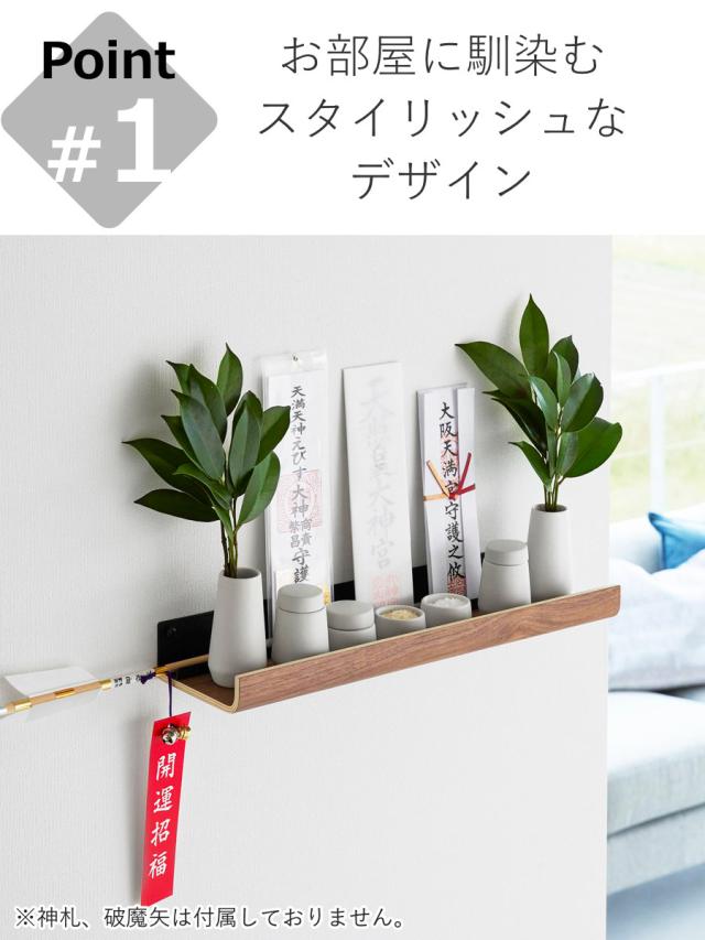 石こうボードの壁に浮かせて取り付けできて、神札、破魔矢を一緒に祀ることができる神棚と神具のセットです。美しい木目がお部屋の雰囲気に合いやすく、ナチュラルな印象を与えてくれます。