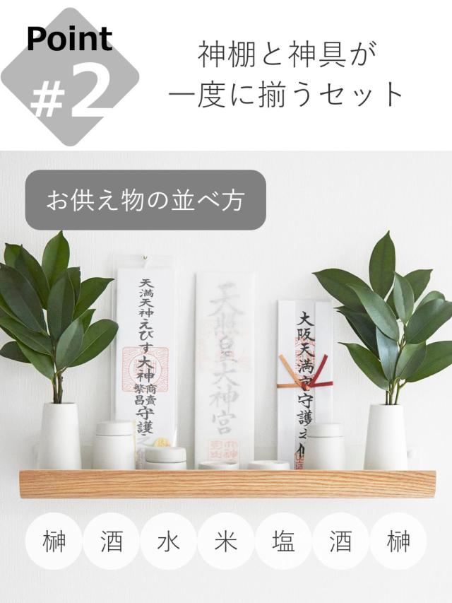 神棚と神具のセットなので、神具をこれから買い揃えたい方にもオススメです。神棚にお供えする際は、左から榊、酒、水、お米、塩、酒、榊の順に置くのが基本です。