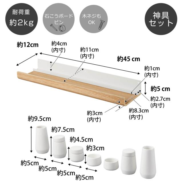 | サイズ | 約 幅45×奥行12×高さ5(cm) 榊立:約幅5×奥行5×高さ9.5cm(1つあたり) 瓶子:約幅5×奥行5×高さ7.5cm(蓋含む)(1つあたり) 水玉:約幅5×奥行5×高さ4.5cm(蓋含む) 皿:約幅5×奥行5×高さ3cm(1つあたり) 内寸 神棚・神具収納部:約幅45×奥行8.3cm 神棚・神札収納部:約幅45×奥行2.7cm |