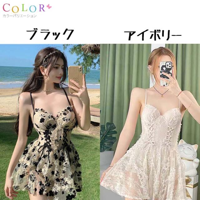大人可愛いフラワー編み上げワンピース水着【水着】【ワンピース】【レース】