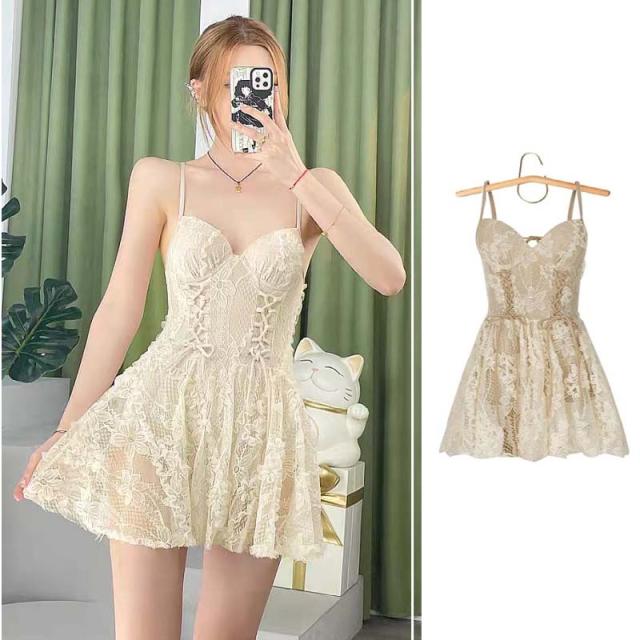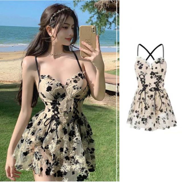 シアーで夏場も涼しく大人可愛いフラワー編み上げワンピース水着。