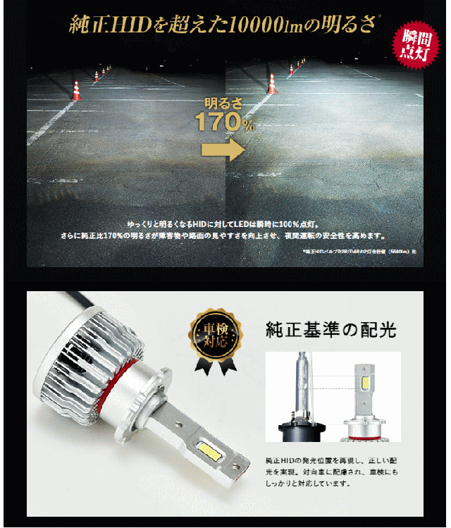 | 純正HID用LEDヘッドライトです。 純正HIDとの明るさ比170%!LEDによる長寿命を実現しました。 D2SとD2Rに対応しており、商品同梱のシェードの装着によって使い分けます。 取付けはLEDバルブを差し込み、コントローラーをユニット内部をしまい込むだけなのでとっても簡単です。一切の加工不要で取付けできます。 LEDにすることでスイッチONからの点灯速度が早く、はっきりとした色合いと明るさで快適にドライブを楽しむことができます。 ■仕様 ルーメン:10000lm(2灯合計値)* 消費電力:30W(1灯値) 動作電圧:12V/24V兼用 カラー :ホワイト(6000K)* 対応形状:D2S D2R * 数値は規格値であり保証値ではありません。 【別売:純正HID用LEDヘッドライト用ゴムカバー】 ・電源ソケットがヘットライトユニット内に収まらない場合は、別売のゴムカバーを使用することで取り付けることができます。 ・光軸調整作業にて電源ソケットをヘッドライトユニット内に収められる場合でも、ゴムカバーを使用することで作業時間を短縮することができます。 ・ゴムカバーにはサイズと適合があります。詳しくはメーカーサイト適合情報をご参照ください。 ■セット内容 ・LEDヘッドライトバルブ×2 ・D2R用シェード ×2 ・固定用ビス ×6 ・両面テープ×2 ・ソケット固定ツール×2 ・取扱説明書兼保証書 ■保証 お買い上げより2年 |
