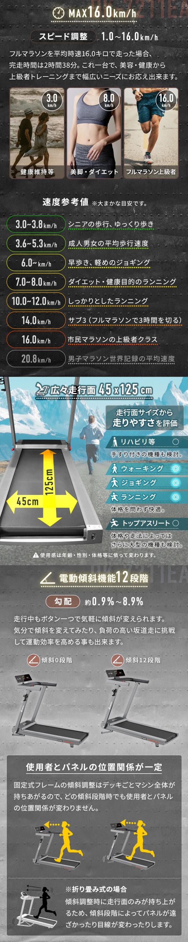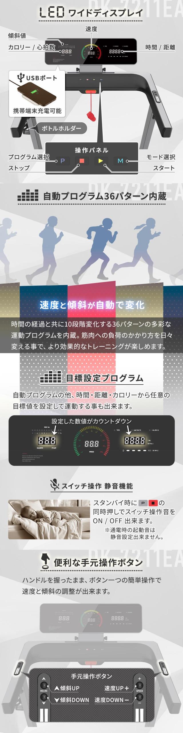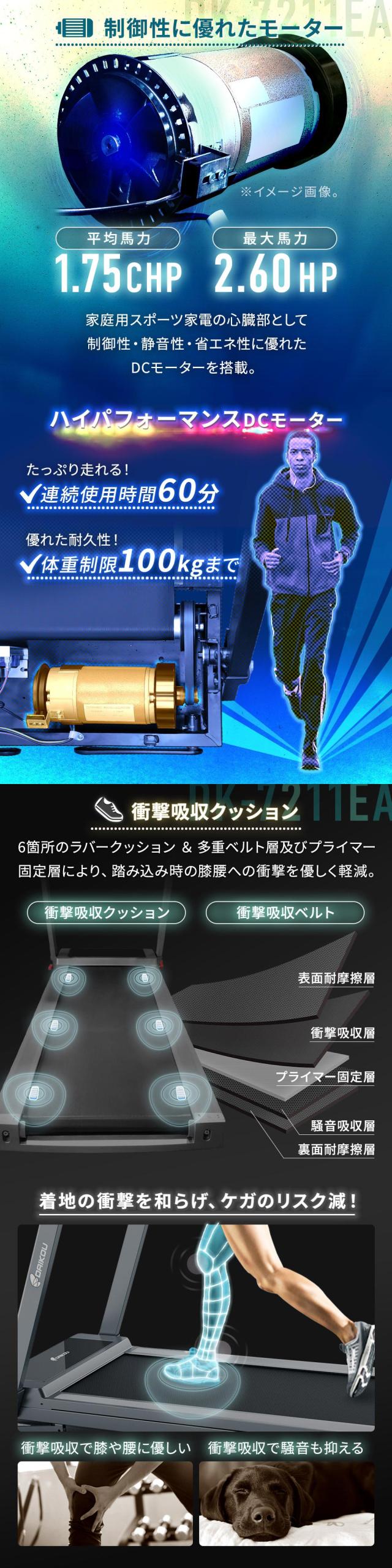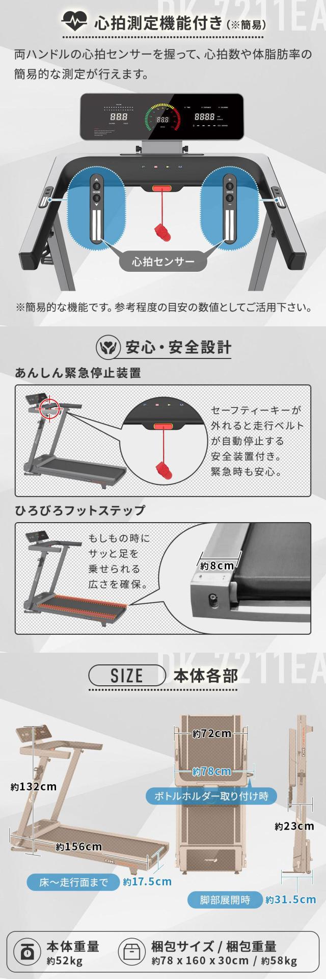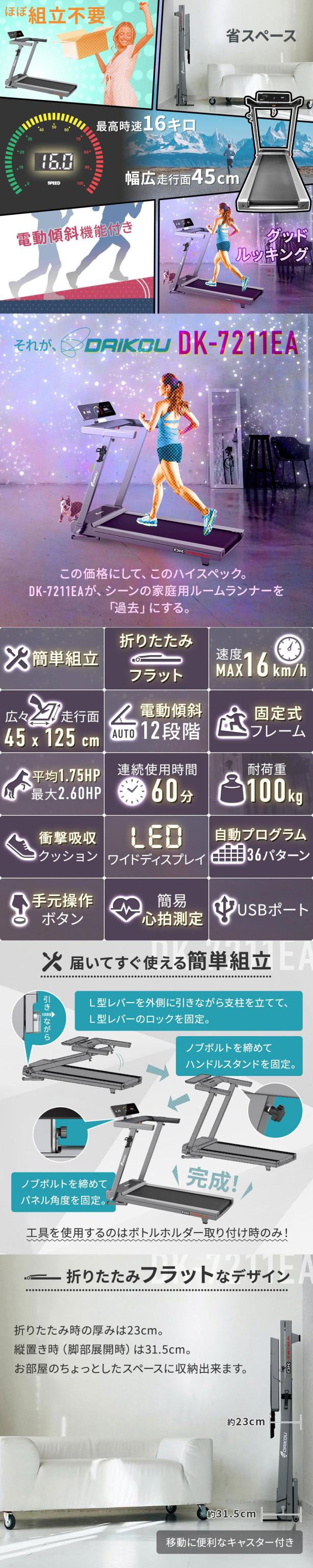 ルームランナー DK-7211EA 電動 静音 家庭用 電動傾斜調整 MAX16km/h 届いてすぐ使える簡易組立 折りたたみ コンパクト 連続使用60分 心拍数測定 手元操作可能 ランニングマシン フィットネス