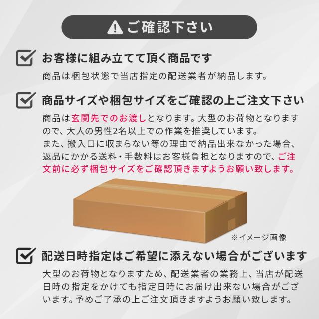 通路が通れない・階段が上がらない・入口が通らないなど搬入経路の確認不足による搬入不可の場合は搬入ができなくてもご返金はお受けできませんので、必ず梱包サイズ・重量をご確認いただき、障害物を含む通路の幅・曲がり角・階段の天井の高さ・階段の切り返しなど搬入経路をしっかりご確認ください。