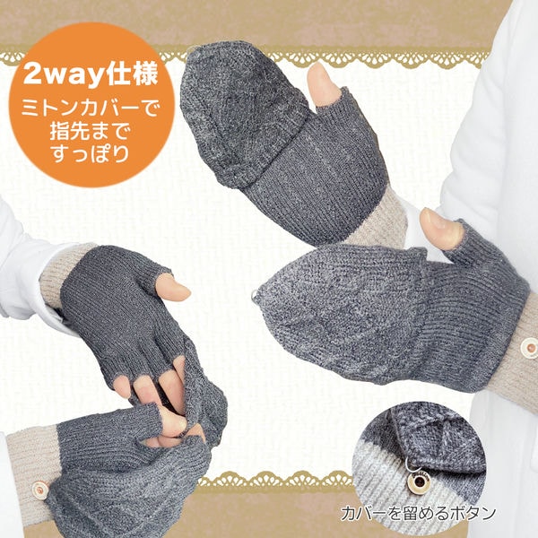 ミトンにも指なし手袋にもなる2way仕様のニット手袋です。