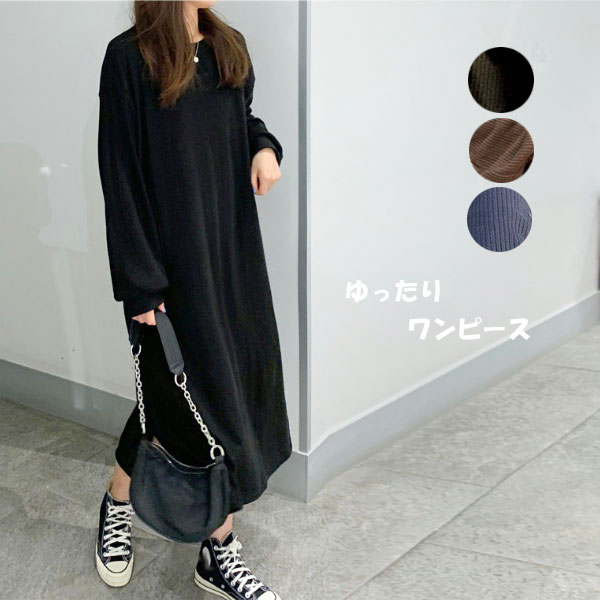 ワンピース ロング丈 Uネック 長袖 マキシ丈 無地 ゆったり レディース トップス ニットワンピース 春 秋冬 オーバーサイズ