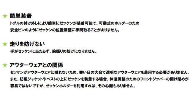 服に穴を開けずにゼッケンを装着できるホルダー付き。
