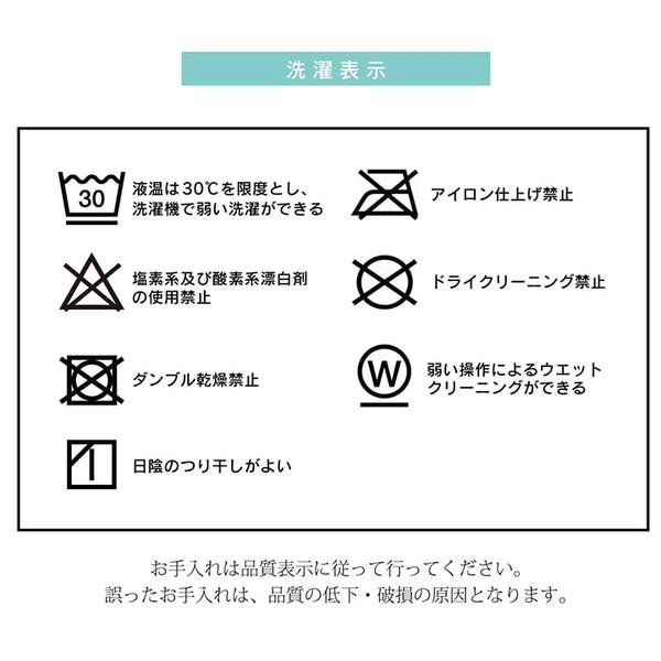40℃以下の水温で弱い手洗いで洗濯してください。(洗濯機は使用できません。) 干し方=日陰のつり干しがよい。