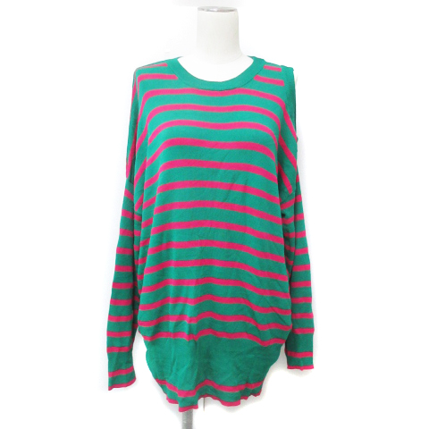 【中古】ジーナシス ニット カットソー 長袖 クルーネック 肩出し オープンショルダー ボーダー柄 F 緑 レディース