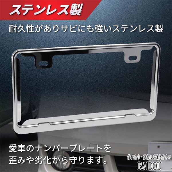 耐久性に優れたステンレス製を採用しており、愛車のナンバープレートを歪みや劣化から守るナンバープレートフレーム2枚セットです。