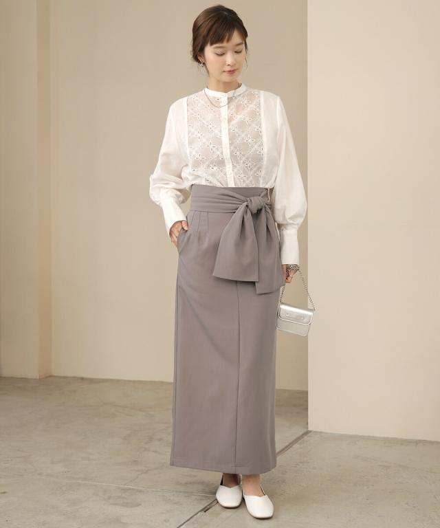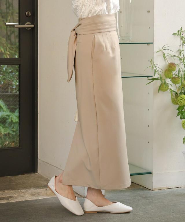ワイドリボンがセットになったIラインスカートです。リボンの位置や結び目を変えるだけでも印象を変えることができます。リボン無しでもダーツがくびれをすっきりと見せてくれ、女性らしさが際立ちます。すっきりしたシルエットながら裾のベンツで足さばきもよく、お呼ばれごとにはもちろんお仕事着としても活躍してくれます。両脇には便利なシームポケット付きで、機能性とデザイン性を兼ね備えた1枚です。サイズ展開があるのも嬉しいポイント。