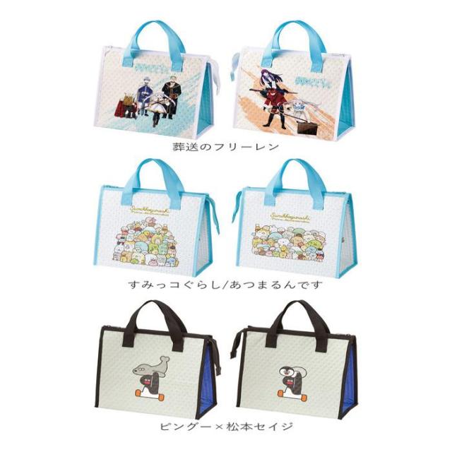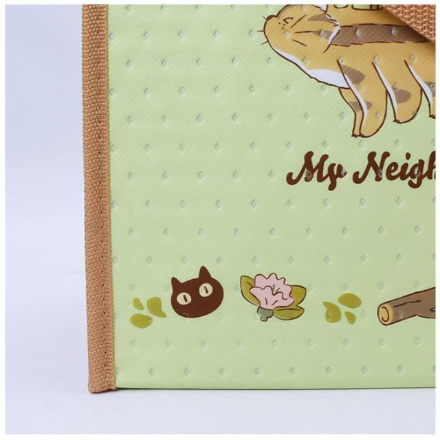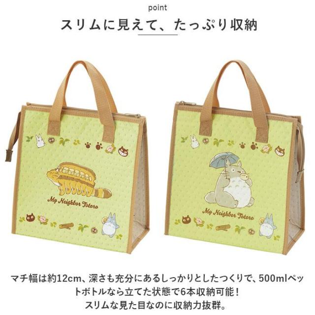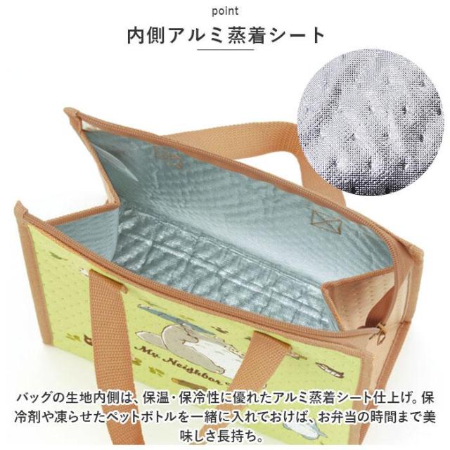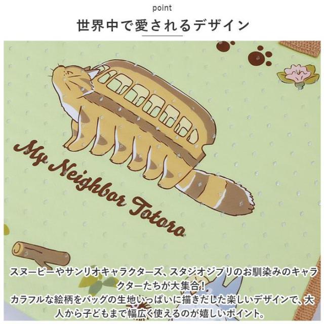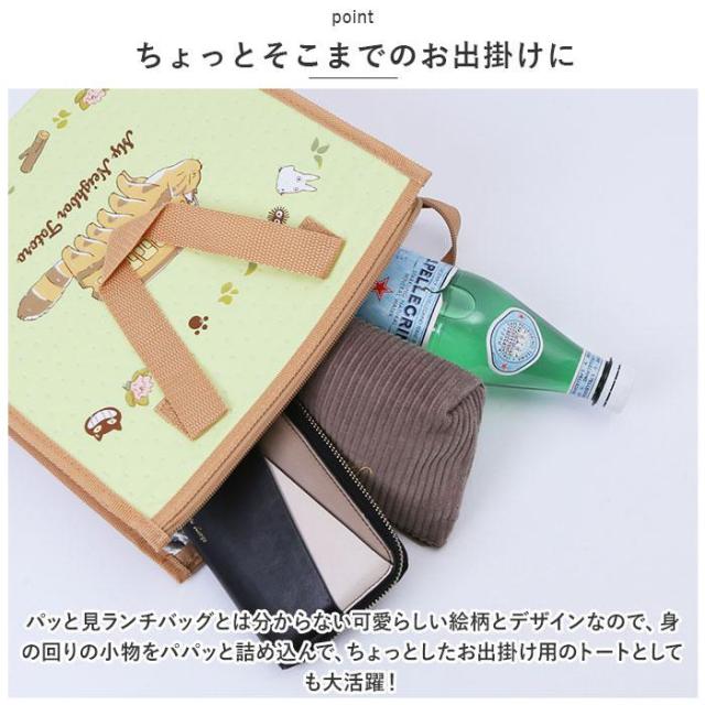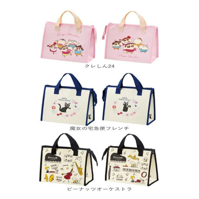 お気に入りのキャラクターと一緒に、ほんわかランチタイム♪ふわっと軽くてたくさん入る「不織布保冷ランチトートバッグ」が新登場。【お弁当箱とマイボトルが一緒に♪】シンプルなスクエア型フォルムとたっぷりのマチ幅で、ランチボックスなら2〜3段縦に積み重ねて、500mlペットボトルは横に倒さずにすっぽりと収納可能。【内側アルミ蒸着シート】バッグの生地内側は、保温・保冷性に優れたアルミ蒸着シート仕上げ。保冷剤や凍らせたペットボトルを一緒に入れておけば、お弁当の時間まで美味しさ長持ち。【安心の天ファスナータイプ】バッグの開口部は、ランチと一緒にしまったカトラリーなどの小物がこぼれる心配のない天ファスナータイプ。左右側面まで大きく開くため、お弁当箱やボトルの出し入れがスムーズ。【スリムに見えて、たっぷり収納】マチ幅は約12cm、深さも充分にあるしっかりとしたつくりで、500mlペットボトルなら立てた状態で6本収納可能!スリムな見た目なのに収納力抜群。【たたむと、とってもコンパクト】使わない時には側面のマチを折りたたんで、スリム&コンパクトに。通勤用カバンの片隅に差し込んでおけば、お仕事帰りに生鮮食品やスウィーツをちょこっと買いしたときにとっても便利♪【世界中で愛されるデザイン】スヌーピーやサンリオキャラクターズ、スタジオジブリのお馴染みのキャラクターたちが大集合!カラフルな絵柄をバッグの生地いっぱいに描きだした楽しいデザインで、大人から子どもまで幅広く使えるのが嬉しいポイント。【ちょっとそこまでのお出掛けに】パッと見ランチバッグとは分からない可愛らしい絵柄とデザインなので、身の回りの小物をパパッと詰め込んで、ちょっとしたお出掛け用のトートとしても大活躍!