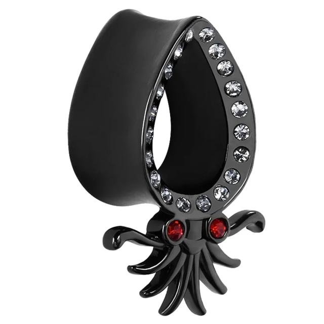 黒色にブラックメッキしたイカを模った面白いダブルフレア型のボディーピアス。ティアドロップ型の烏賊の頭と大きく手を広げたゲソにクリスタルとレッドのジルコニアをセットしたホール系ボディピアス。面白いクラーケンをモチーフにしたホールピアスは、ハロウィーンの海賊のコスプレや仮装にも使えそうなボディーピアスです。