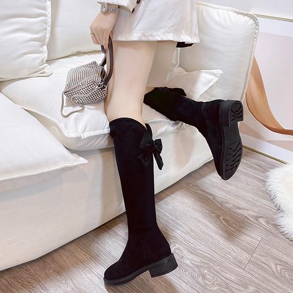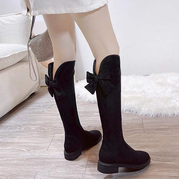 美脚ロングブーツ チャンキーヒール シンプル 疲れない ニーハイブーツ フィット スエード 秋 冬 太ヒール 美脚 疲れにくい 可愛い フェミニン ガーリー きれいめ 通勤 バックリボン 黒cs099s1s1l9