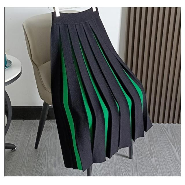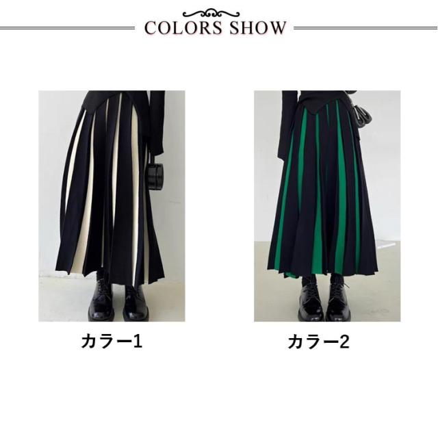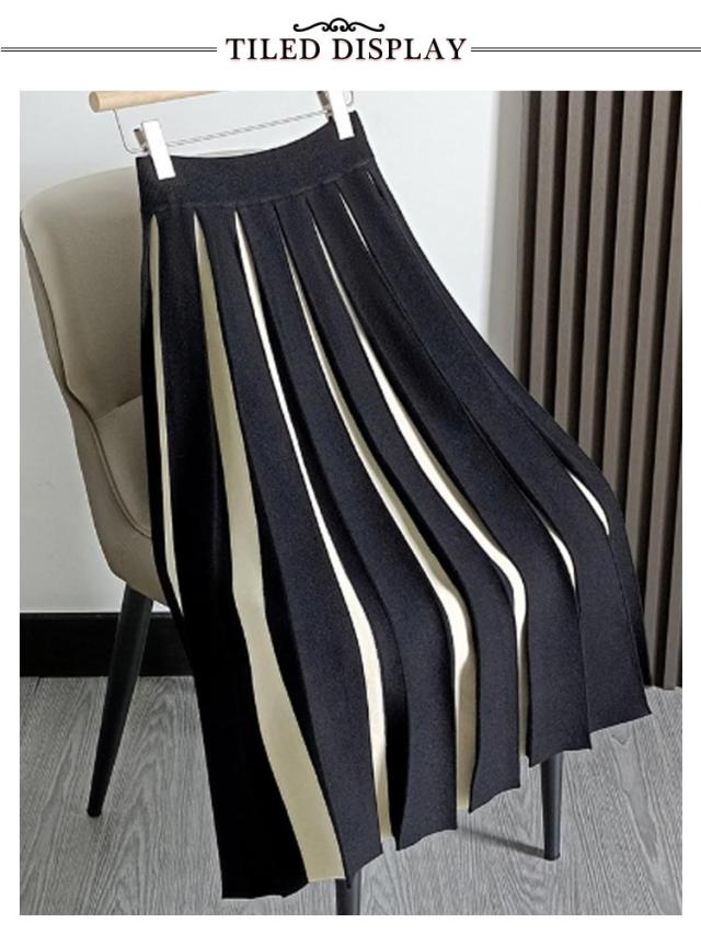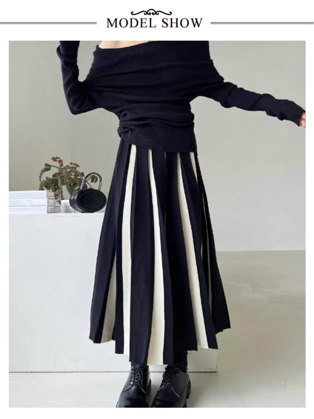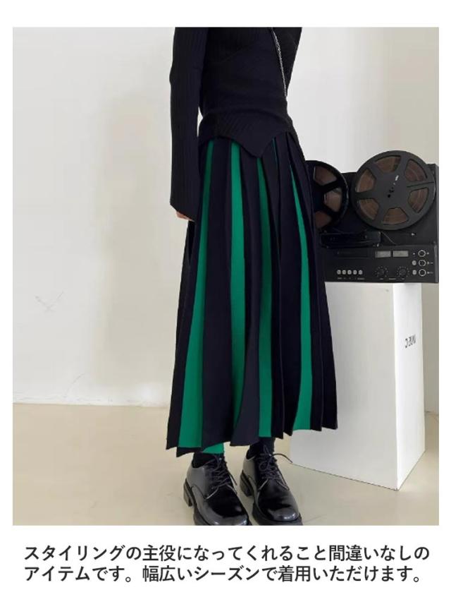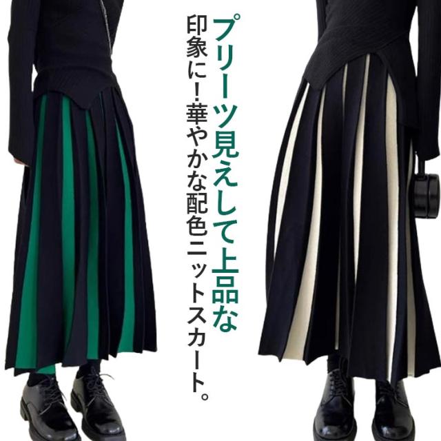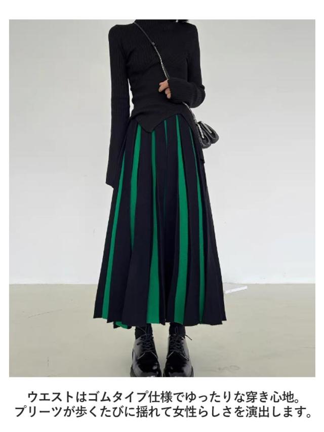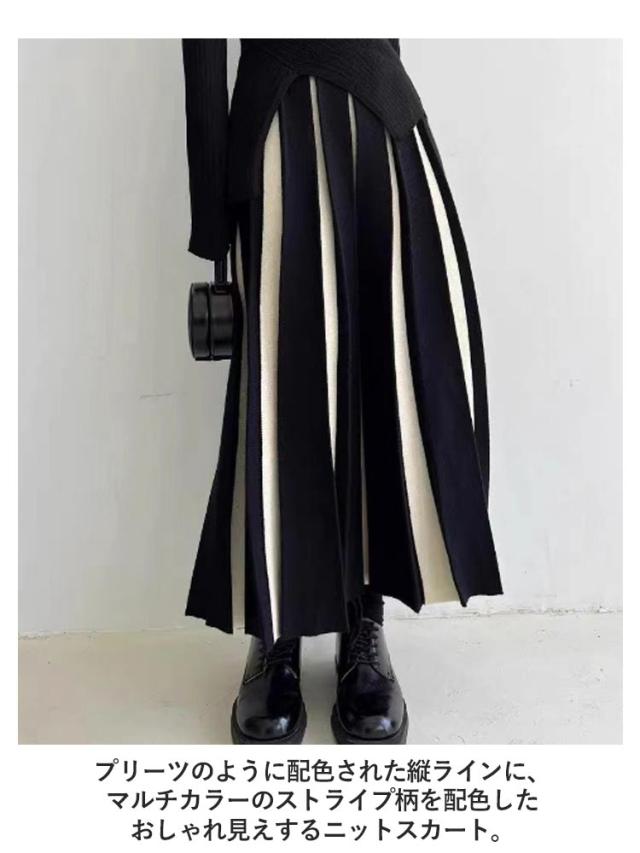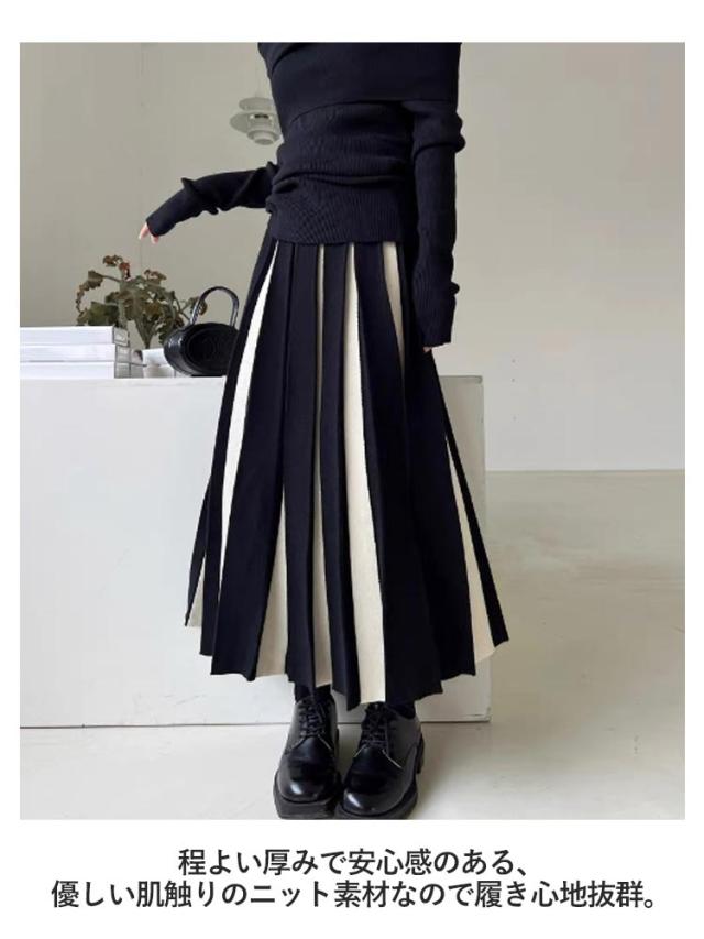 ニットスカート プリーツ風スカート スカート フレア プリーツ 秋冬 ひざ下 ロングスカート Aライン 切替 配色 個性的 ハイウエスト 華奢見え 体型カバー おしゃれ ゆったり カジュアル ナチュラル 女子 美ライン 脚長効果