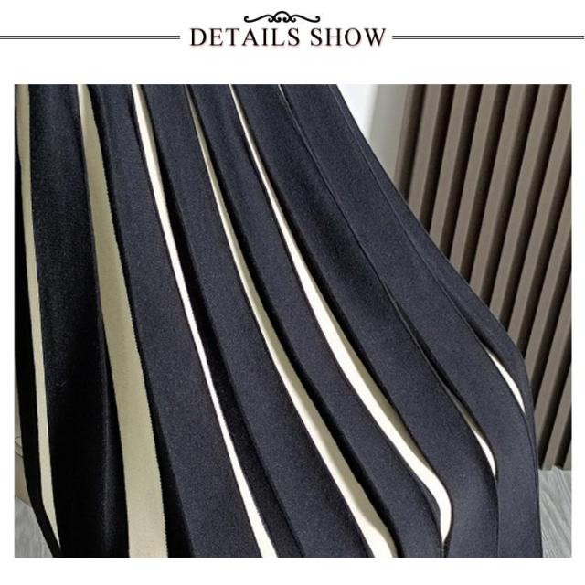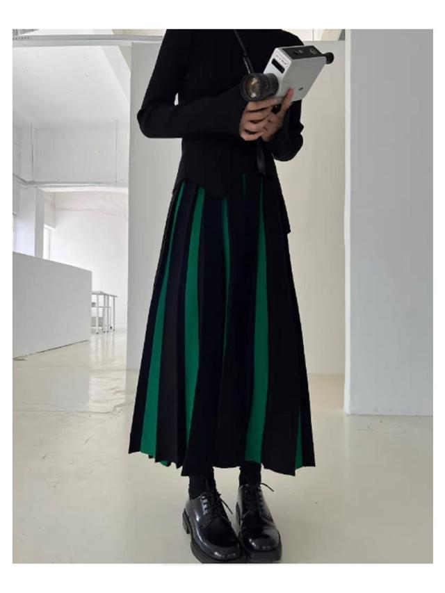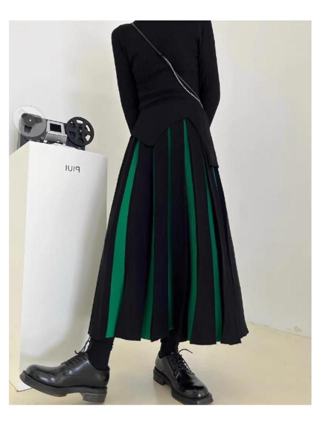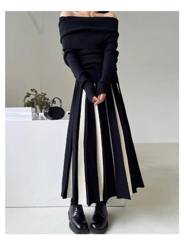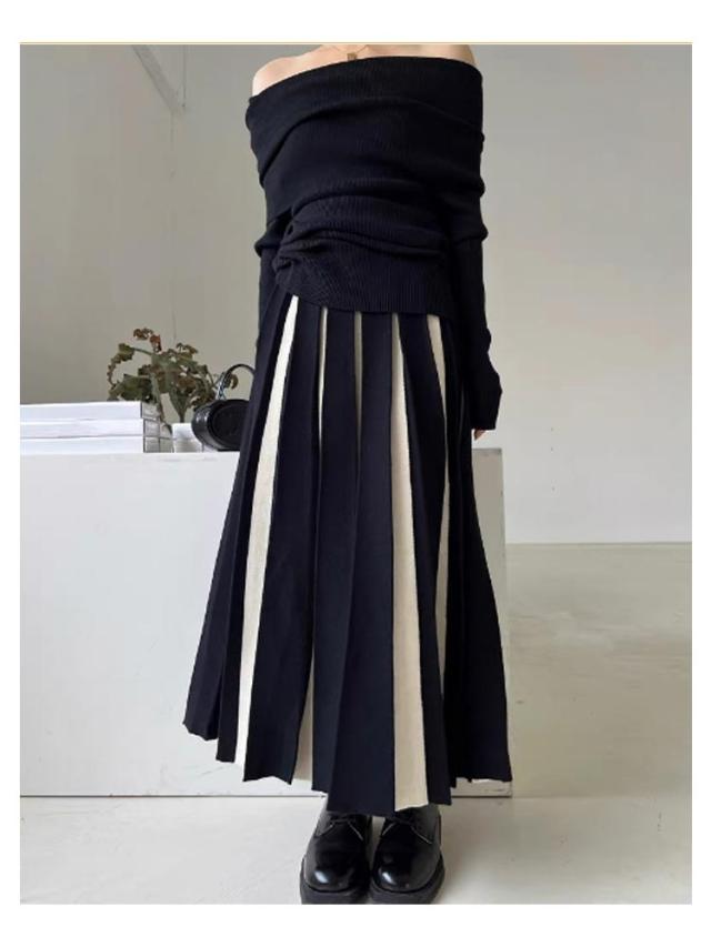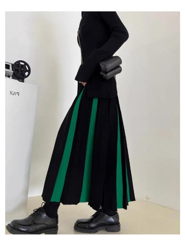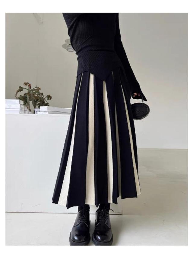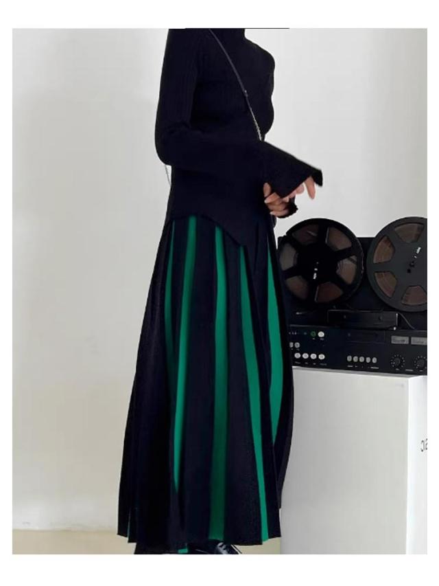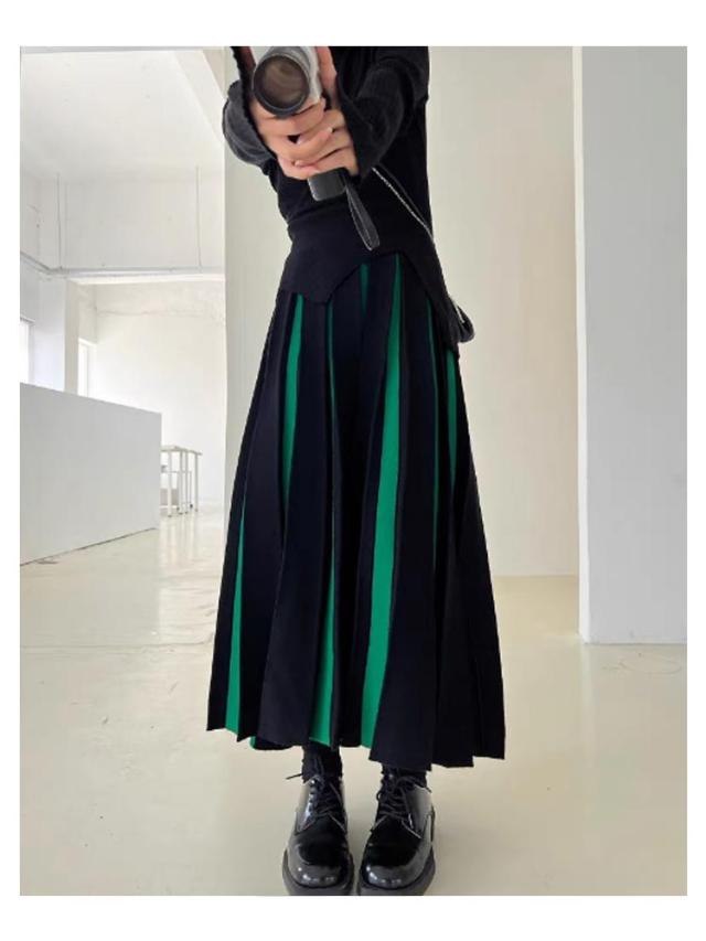 ニットスカート プリーツ風スカート スカート フレア プリーツ 秋冬 ひざ下 ロングスカート Aライン 切替 配色 個性的 ハイウエスト 華奢見え 体型カバー おしゃれ ゆったり カジュアル ナチュラル 女子 美ライン 脚長効果