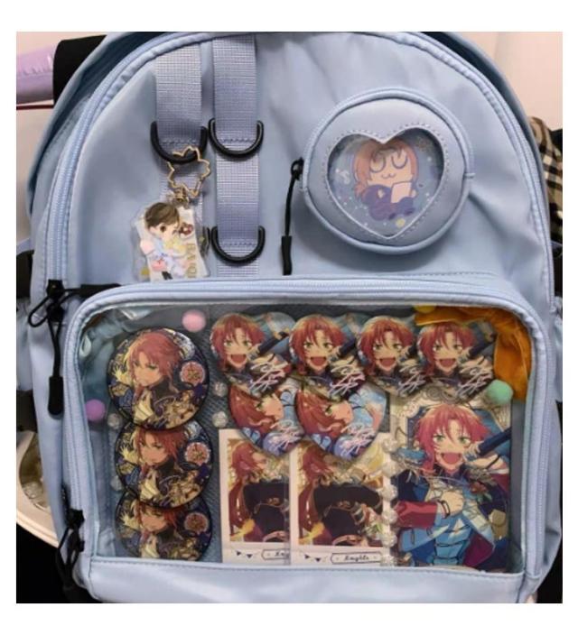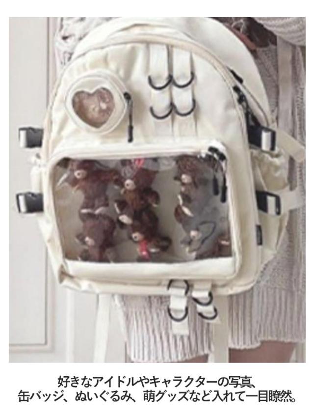 | 缶バッジやぬいぐるみなど推しのグッズを入れて一緒にお出かけできる大容量の防水痛リュック。 フロントに透明ポケットで見せたいアイテムを自由にアレンジできます。 好きなアイドルやキャラクターの写真、缶バッジ、ぬいぐるみ、萌グッズなど入れて一目瞭然。 大容量のA4サイズ、雑誌 、ipad、折り畳み傘や本など収納可能ので、通学や出かけにもおススメです。 普段使いはもちろん、アイドルやアニメの推しイベントでも大活躍。 | |