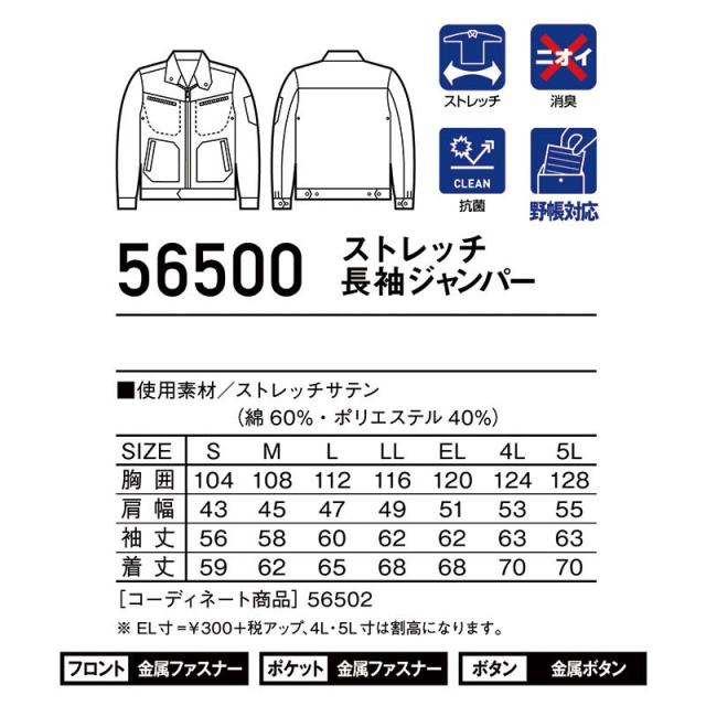 自重堂 制服百科 Jawin ジャウィン 長袖 ジャンパー EL 作業着 ストレッチ ジャケット 上着 消臭 抗菌 野帳対応 ワークウエア 56500 宅配のみ