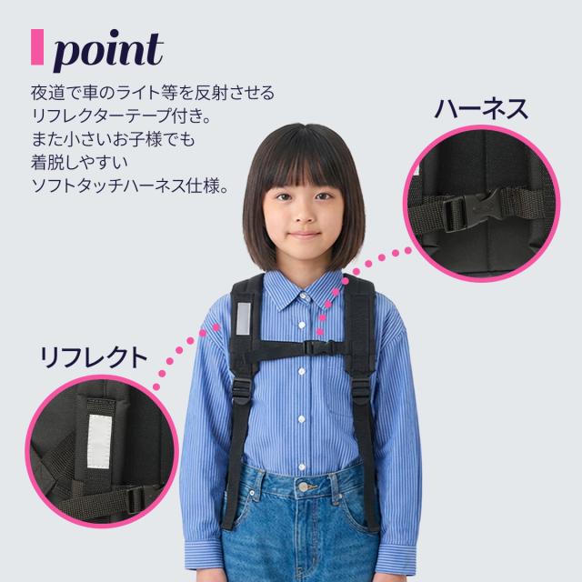 ベルトの長さは調節でき、ハーネスで固定できるので幅広い年齢のお子様に対応します。