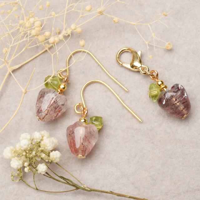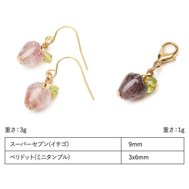 | 特徴・意味 | 日頃の感謝の気持を込めて、厳選したオススメ天然石を使用したデザインアクセサリーが、 お値打ち特価価格で登場! 複数のアイテムがセットになっていてお得感満載です! ----------------------------------------------------------------------------------------------------- 総合的な運気アップに人気のスーパーセブンを贅沢に使用した煌めき溢れるアクセサリーを制作いたしました。 7つの魅力を詰め込んだスーパーセブンは、運気の好転、潜在能力の開花に効果があるとされ、 夢や目標を達成するためのお守りとしても適しています。 今回使用したスーパーセブンは上質で、特殊な形状のものを使用しブレスレットは ブラックスーパーセブンでリボン風に。 ピアスはレッドスーパーセブンを使用し、いちごのような可愛らしいデザインに仕上げました。 ピアスの金属部分は金属アレルギーが起こりにくい素材として人気のサージカルステンレス(316Lステンレス)を使用しています。 カラーや内包物など様々なスーパーセブンの魅力を存分にご堪能ください。 材質 ▼ (画像4・7枚目) 内径:約15cm 重さ:約20g ラリマー:10mm スギライト:10mm チャロアイト:7mm 水晶ボタンカット:3x6mm (画像5・8枚目) 内径:約15.5cm 重さ:約17g ラリマー:8.5mm スギライト:10mm チャロアイト:10mm ラベンダーアメジスト:8mm 水晶スターカット AA:8mm 水晶ボタンカット:3x6mm (画像6・9枚目) ピアス 全長:約2.5cm 重さ:約3g イチゴ スーパーセブン:9mm ペリドット(ミニタンブル):3x6mm U字フック サージカルステンレス ※ピアスは繊細な作りとなっておりますのでお取り扱いには十分にお注意ください。 ※重量は両耳分の重さになります。 チャーム 全長:約2.5cm 重さ:約1g イチゴ スーパーセブン:9mm ペリドット(ミニタンブル):3x6mm カニカン ストラップ 浄化用 ローズクォーツ さざれ:約100g |