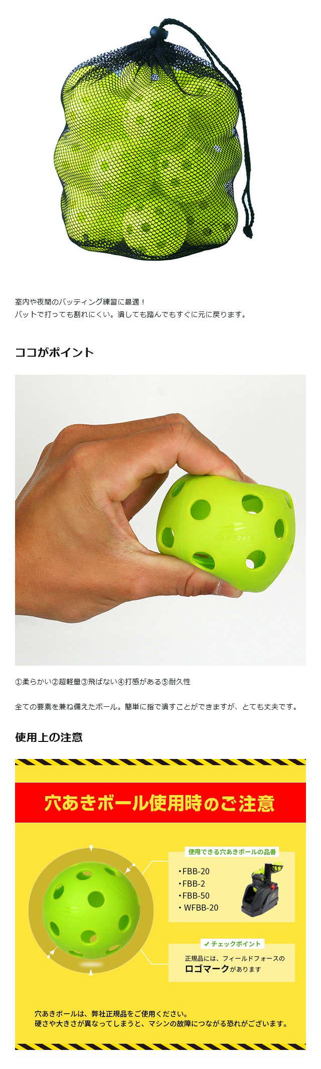 フィールドフォース 練習ボール 20個入り イエロー 黄色 バッティング練習 野球 トレーニング 超軽量 部活 チーム練習 宅トレ 穴あきボール ミニボール FBB-20-YEL