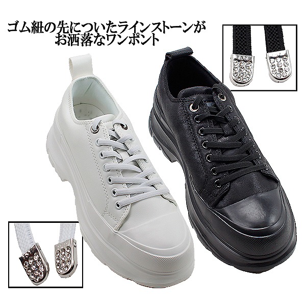 スタイルアップが楽しいダッドスニーカーです。トレンドなコーディネートと美脚が叶う厚底スニーカー、丸いトゥのボリュームソールで可愛くスタイルアップになります。ゴム紐の先についたラインストーンがお洒落なワンポントです。軽量設計で歩きやすい♪