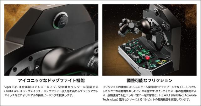 ・ Viper TQS では、機械的なレバーとハンドルの回転によって Idle/Cutoff および Afterburner ディテントにアクセスできる、軸レールがリアル感あふれるフィーリングが再現されています。