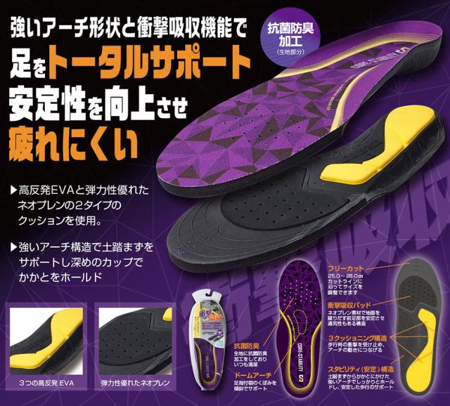 強いアーチ形状と衝撃吸収機能で足をトータルサポート
