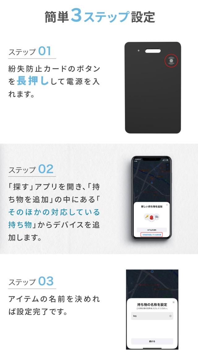 1.紛失防止カードのボタンを長押しして電源を入れます。