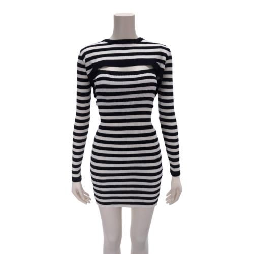 【グラシア】 キャバ ドレス キャバドレス ワンピース ミニドレス カット タイト フロントカット ボーダー 胸元 ニット ブラック×ホワイト フリーサイズ