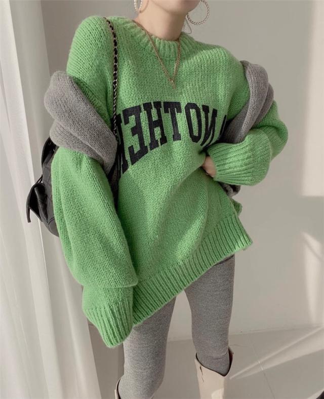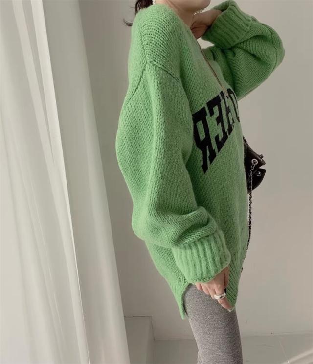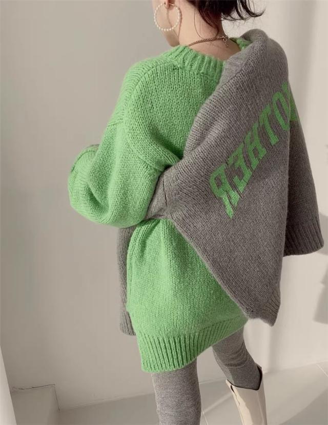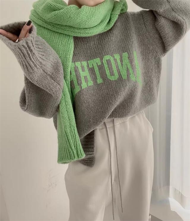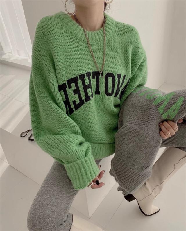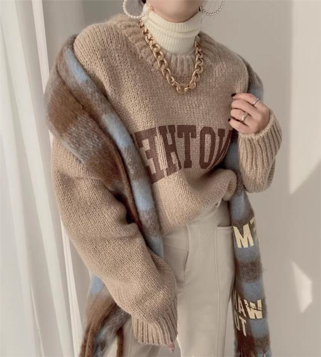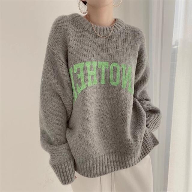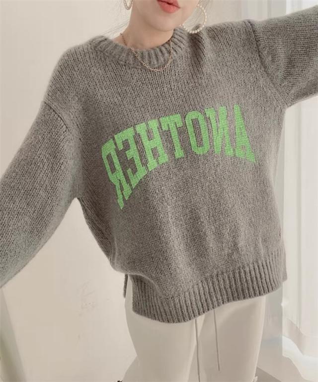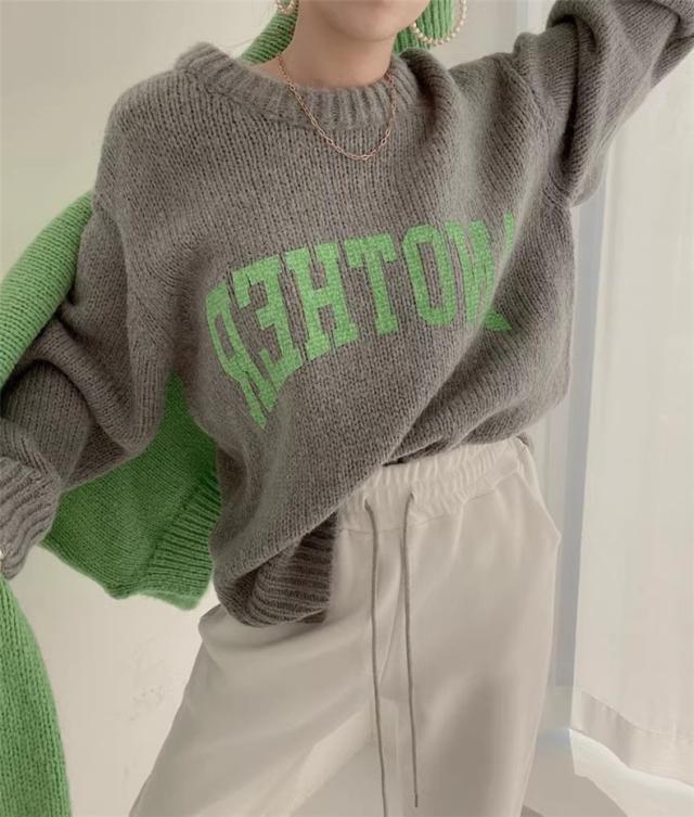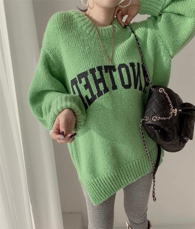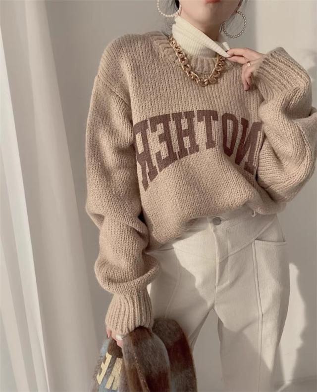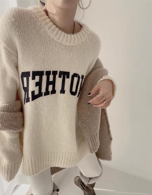 ニット トップス レディース 秋冬 厚手 セーター プルオーバー 長袖 クルーネック 体型カバー 英字柄 コーデの差し色に おすすめ オトナな休日スタイルに