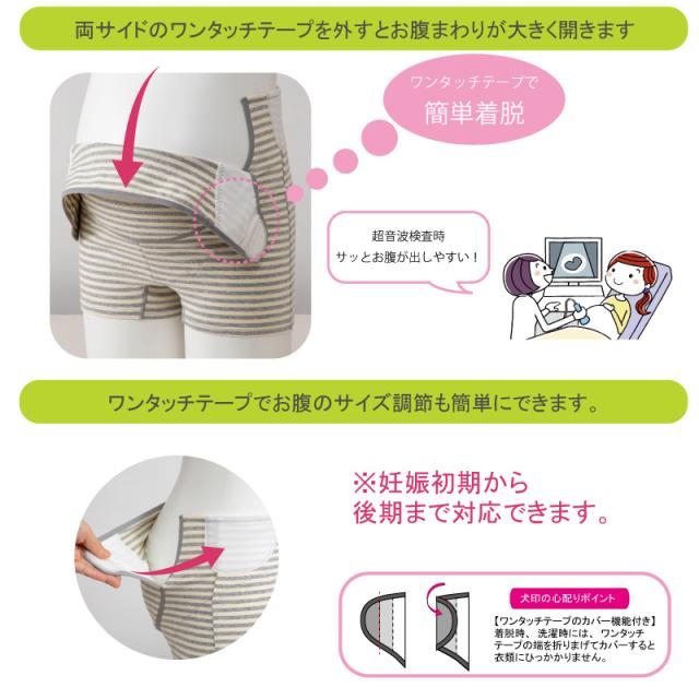 両サイドのワンタッチテープを外すとお腹まわりが大きく開き、妊婦検診時にさっとお腹が出しやすい♪