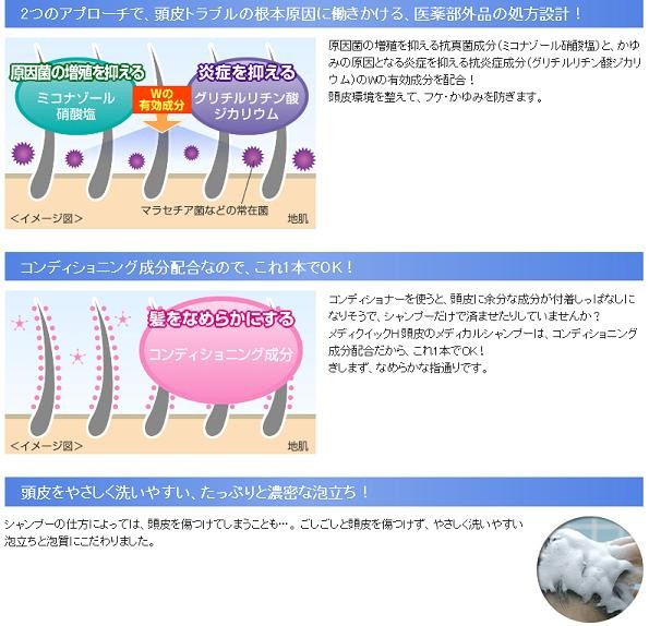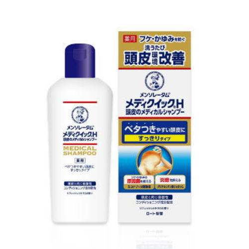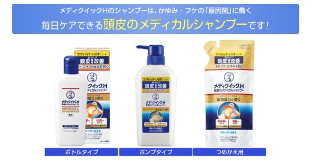 「メンソレータム メディクイックH 頭皮のメディカルシャンプー」は、フケ・かゆみの原因菌の増殖を抑える抗真菌成分(ミコナゾール硝酸塩)と、炎症を抑える抗炎症成分(グリチルリチン酸ジカリウム)を配合した薬用シャンプー。