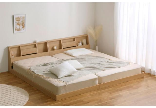 床板が低く、お部屋に開放感を生み出すフロアベッドです。くつろぎ空間を演出します。マットレスのズレを防ぐ落とし込みタイプです。フレーム内にマットレスが収まります。床までの距離が近く、ベッドから転落しても衝撃が緩和できます。小さなお子さまがいるご家庭でも安心してお使いいただけます。ヘッドボードは魅せる収納・隠す収納、どちらも揃っています。扉を閉めるとブックスタンド、タブレットやスマホスタンドになります。扉内は2口コンセント付きで便利です。オープンスペースは小物を置いてベッド周りを使いやすくできます。床板はすのこ仕様で通気性がよく湿気が溜まりにくく、オールシーズン快適です。お客様組み立てとなります。