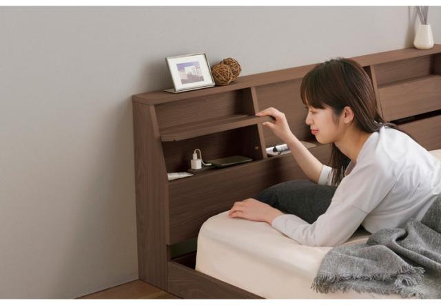 床板が低く、お部屋に開放感を生み出すフロアベッドです。くつろぎ空間を演出します。マットレスのズレを防ぐ落とし込みタイプです。フレーム内にマットレスが収まります。床までの距離が近く、ベッドから転落しても衝撃が緩和できます。小さなお子さまがいるご家庭でも安心してお使いいただけます。ヘッドボードは魅せる収納・隠す収納、どちらも揃っています。扉を閉めるとブックスタンド、タブレットやスマホスタンドになります。扉内は2口コンセントが2つ付きで便利です。オープンスペースは小物を置いてベッド周りを使いやすくできます。床板はすのこ仕様で通気性がよく湿気が溜まりにくく、オールシーズン快適です。お客様組み立てとなります。
