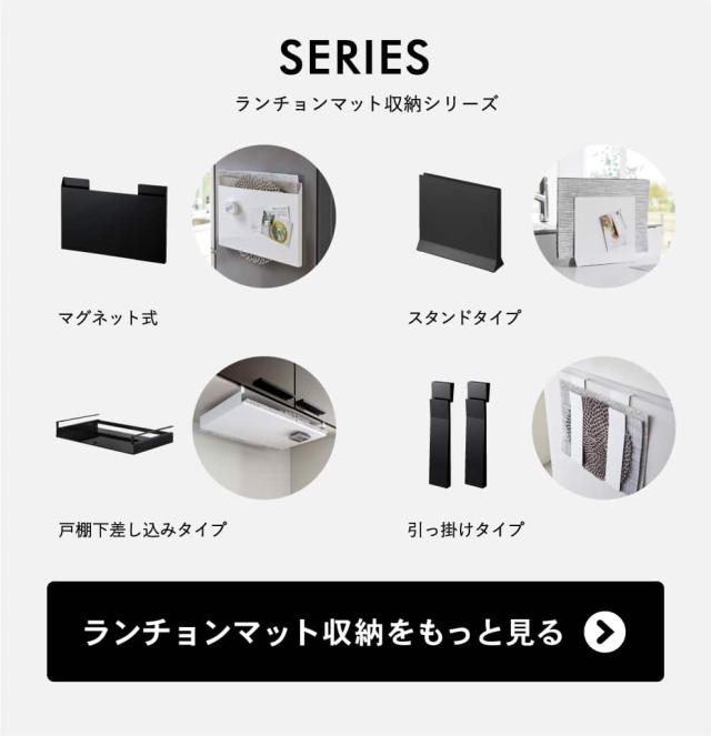 ランチョンマットやトレーを浮かせて収納できるスタンド。幅約6cmのスリム設計。円形のランチョンマットも収納可能。マグネット小物をつけて使える丈夫なスチール製。 yamazaki