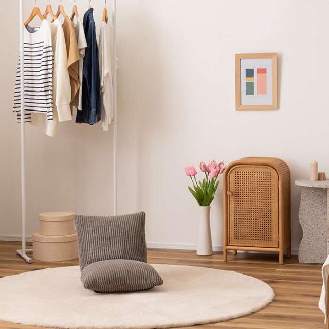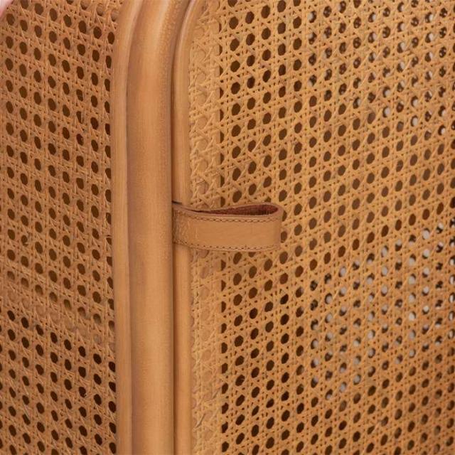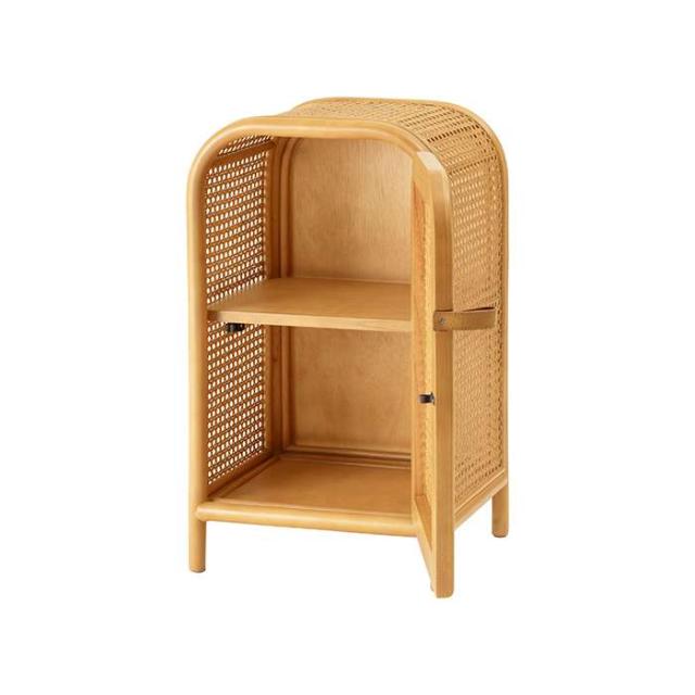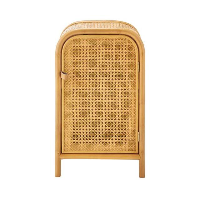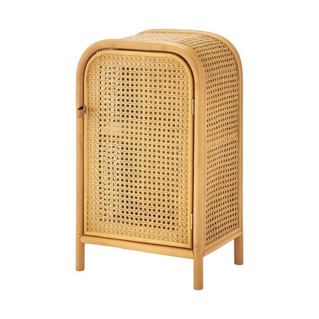 キャビネット。丸みを帯びたフォルムに全体に編み込まれたカゴメラタンが個性的コンパクトなミニキャビネット。