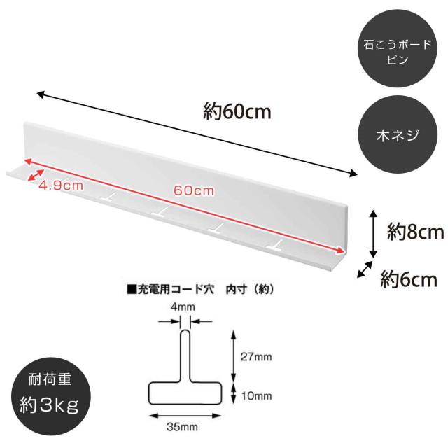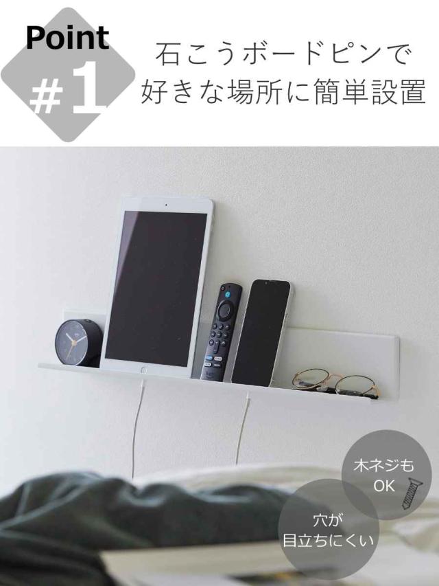 タブレットやスマートフォン置きに便利なスリム棚です。石こうボードピンや木ネジで好きな場所に取り付けができます。石こうボードピンで壁の穴も目立ちにくく、壁に穴を開けたくない方でも気軽に設置できます。