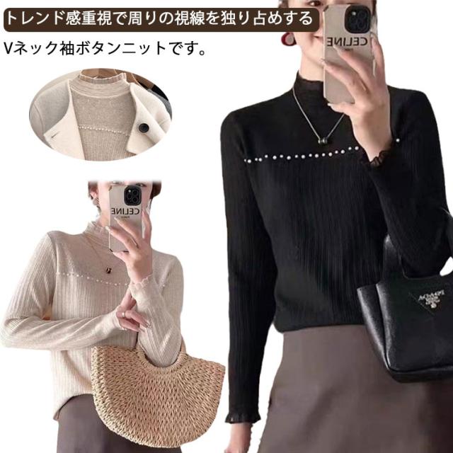 シルエット 冬 レディース ハーフタートルネック タイト セーター トップス リブニット レース ニット ニットトップス 長袖 秋 インナー パール カットソー 暖かい 厚手 春 秋 冬 可愛い お洒落 きれいめ 無地 シンプル カジュアル エレガント