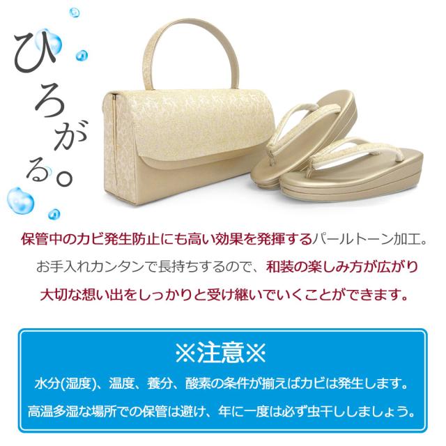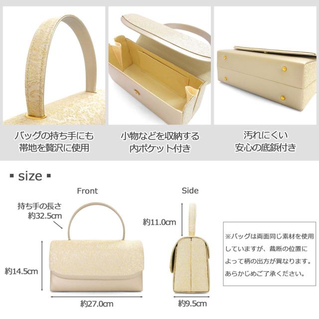 バッグ単品でもお使いいただけ、留袖はもちろん披露宴やパーティー、様々なシーンにお使いいただけます。