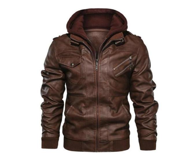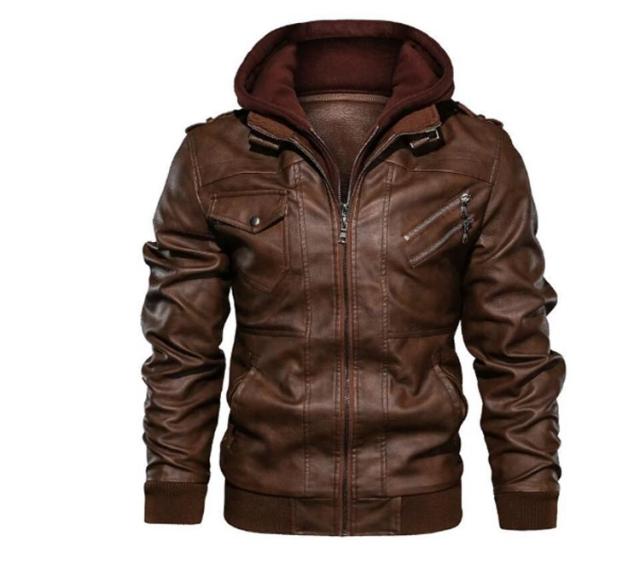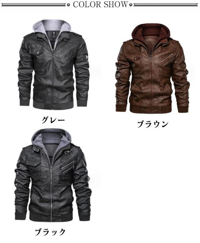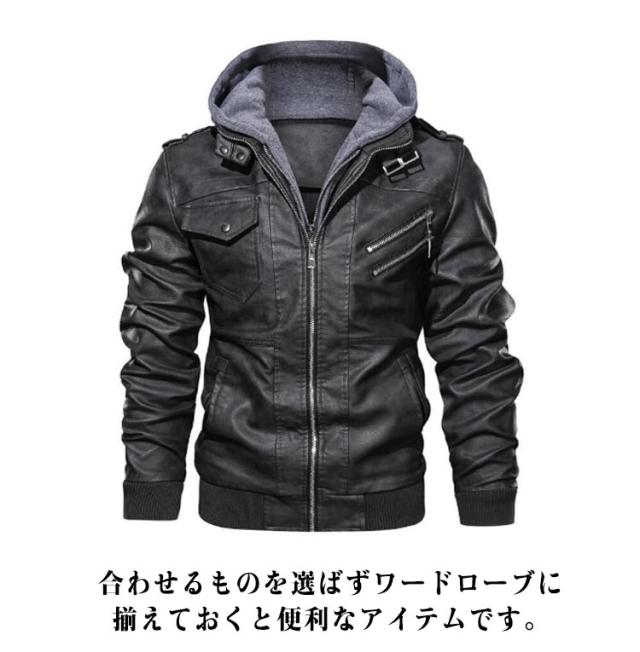ライダースジャケット メンズ 革ジャン レザージャケット バイクジャケット フード付き レザーパーカー フード脱着可 皮ジャン アウター ブルゾン フェイクレイヤード 重ね着風 スリム 細身 合皮 カジュアル カッコイイ 春 秋 冬