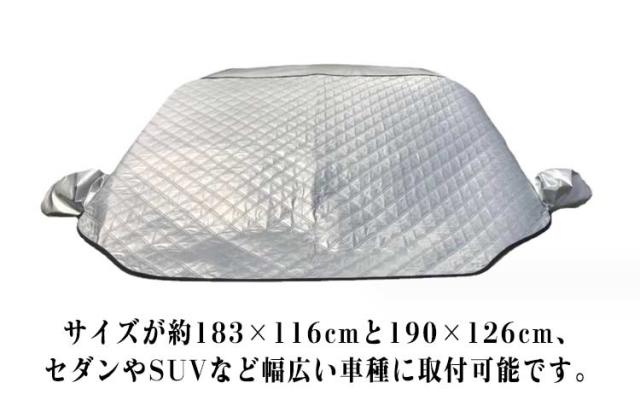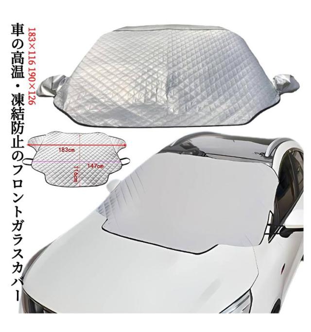 | ・車の高温・凍結防止のフロントガラスカバー ・柔らかい素材を採用しているので、フロントガラスに傷がつきにくく雪や埃から守ります。 ・サイズが約183×116cmと190×126cm、セダンやSUVなど幅広い車種に取付可能です。 ・フロントドアに挟む固定用の耳がついているので、取り外す際は手を汚さず簡単に脱着可能。 ・下部の中心には磁石が内蔵されており、強風でも飛ばされずに固定できます。 ・黄砂や落ち葉防止にも。 ・年中使えるカバーです。 | |