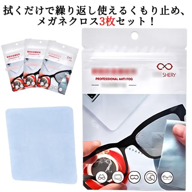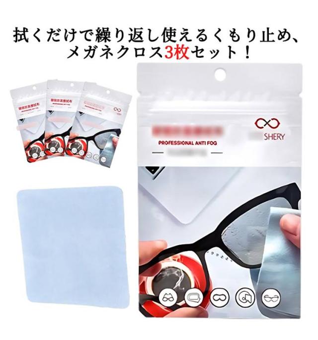 | サイズについての説明 | 【サイズ】14cm×15cm 【枚数】3枚セット 【使用回数】300回以上使用可能 【効果時間】一度の使用で12時間持続 ※くもり止め効果や持続時間は使用環境により異なります。 |