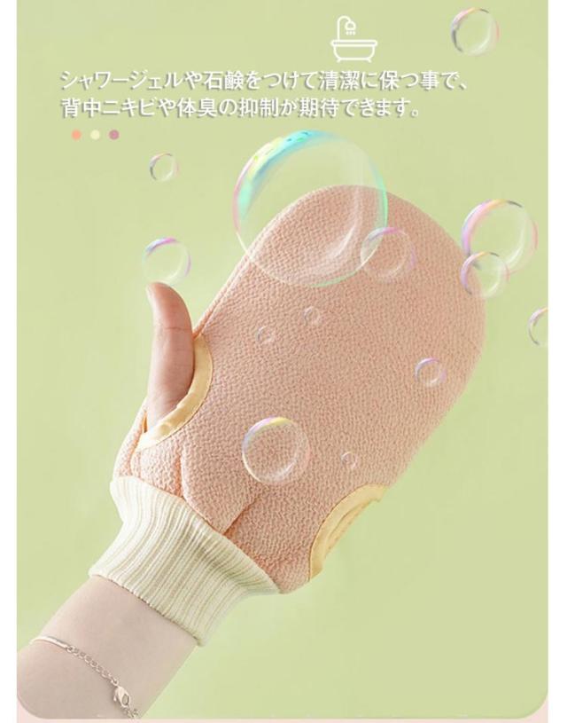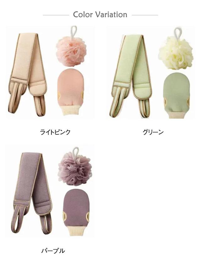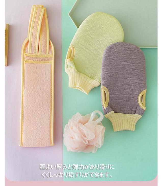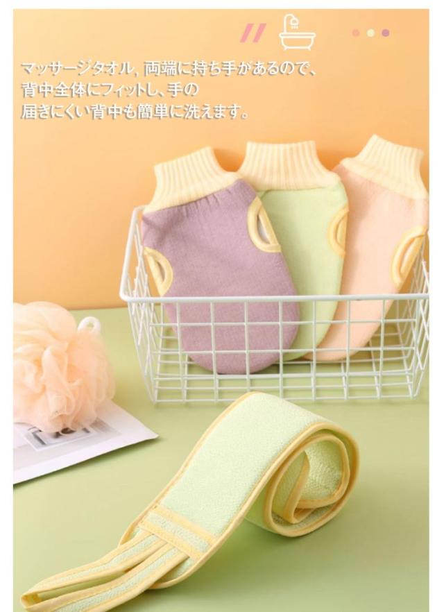| 垢擦りミトン・ふわふわ泡立ちボール・スクラブタオルの垢擦り3点セットです マッサージタオル, 両端に持ち手があるので、背中全体にフィットし、手の届きにくい背中も簡単に洗えます。 シャワージェルや石鹸をつけて清潔に保つ事で、背中ニキビや体臭の抑制が期待できます。 効果 お肌にやさしく角質除去。かかと、ひじ、ひざなど気になる部分を集中ケア。 古い角質をほどよい強さで 角質取り してくれるため、スッキリ!体臭ケアの効果が期待できます♪ 程よい厚みと弾力があり滑りにくくしっかり垢すりができます。 | |
