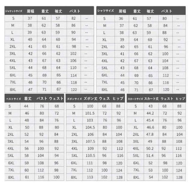 | 色 | 黒西+白+スカート 黒西+白+ズボン 紺西+白+スカート 紺西+白+ズボン 黒西+スカ+ズボン 紺西+スカ+ズボン 黒西+ベスト+ズボン 紺西+ベスト+ズボン |