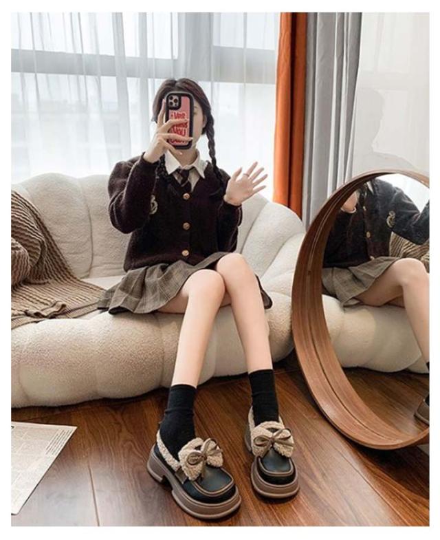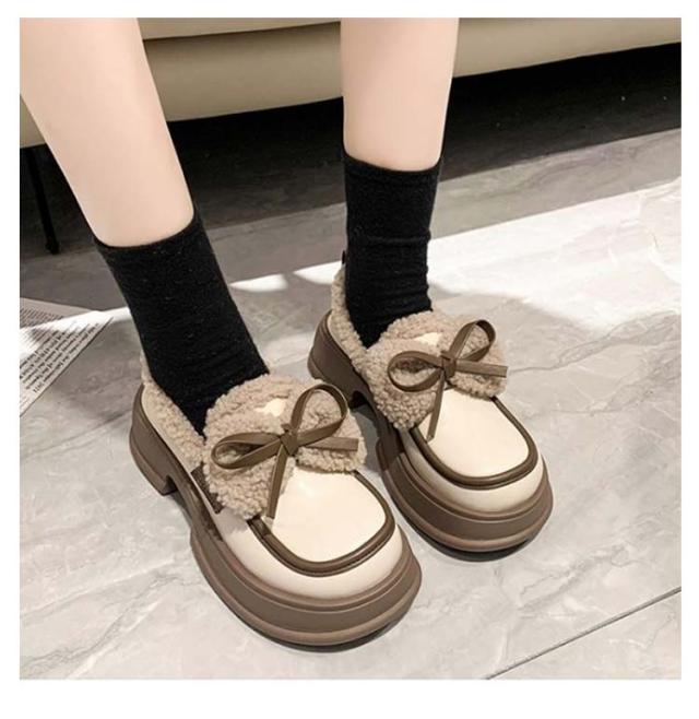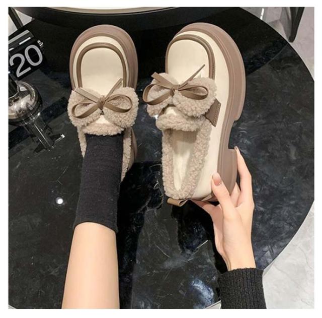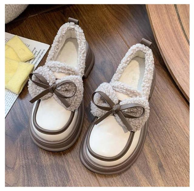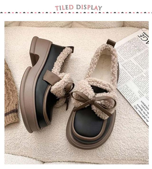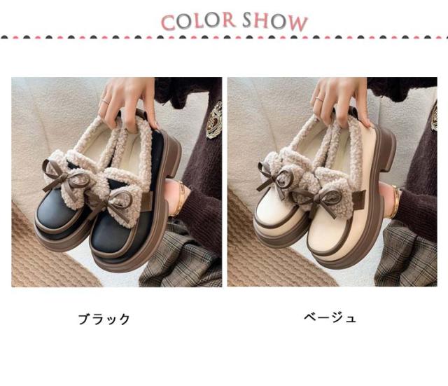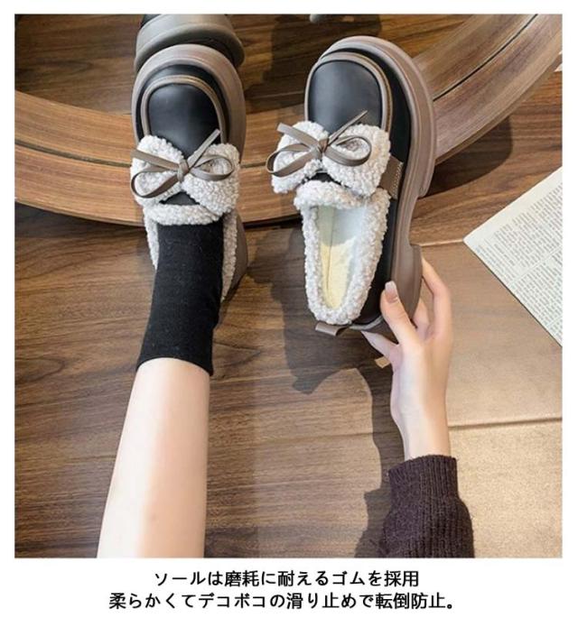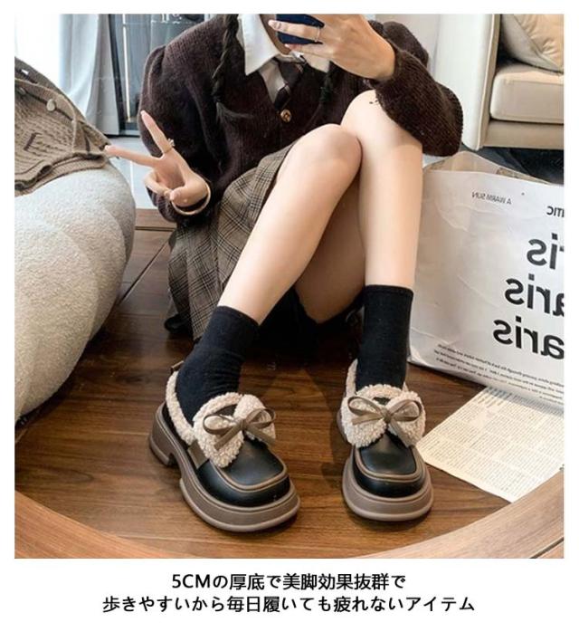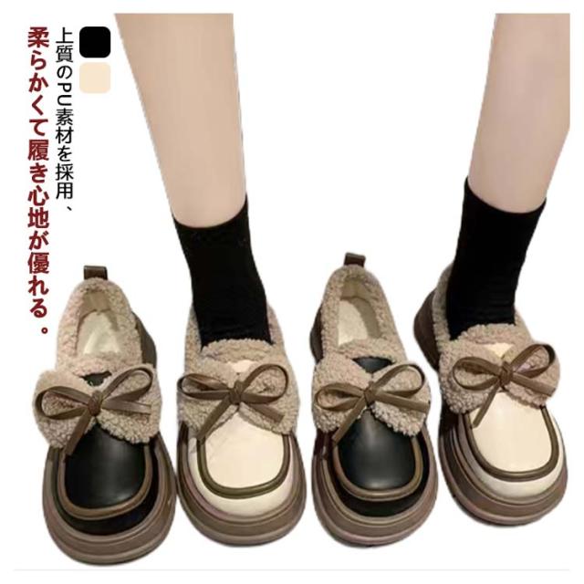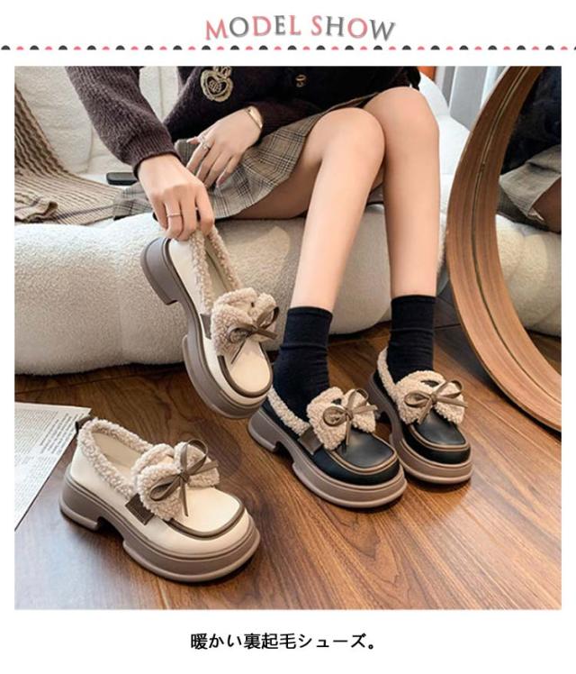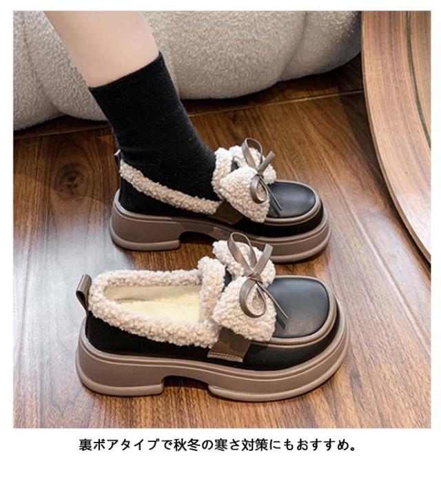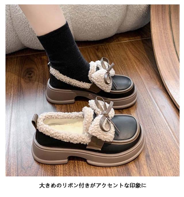 ローファー 裏起毛 リボン付き フォーマルシューズ レディース 合皮 厚底シューズ 5cmヒール 秋冬 ボア 通学 歩きやすい