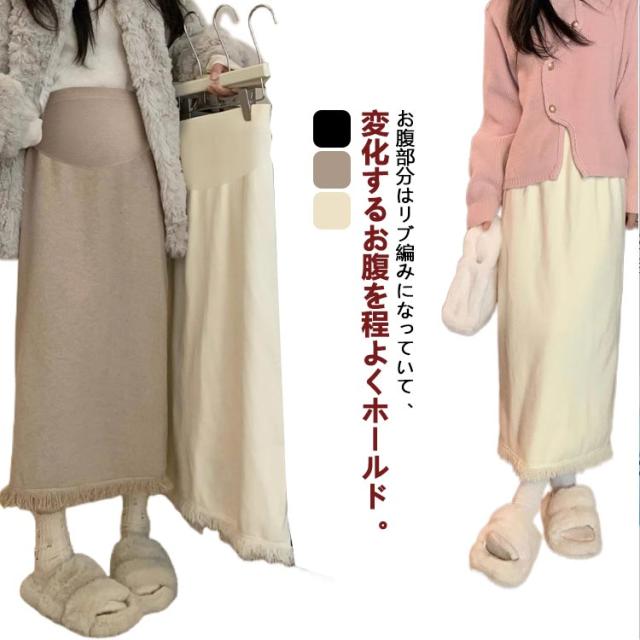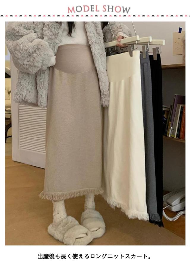 マタニティ スカート ニットスカート ロング ミモレ丈 マタニティスカート 無地 フリンジ カジュアル ウエストゴム 楽ちん ゆったり 産前 産後 春 秋 冬