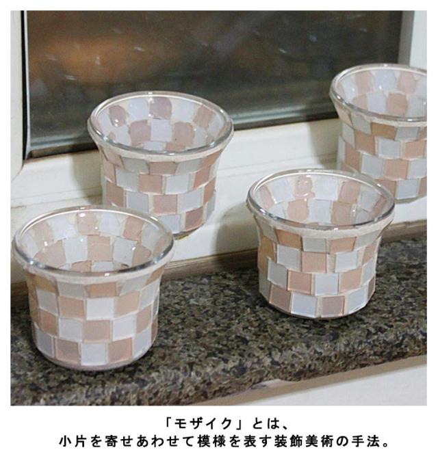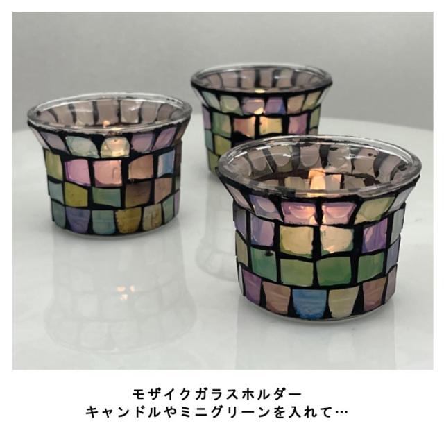 | モザイクガラスホルダー キャンドルやミニグリーンを入れて… 「モザイク」とは、小片を寄せあわせて模様を表す装飾美術の手法。 ちょっと珍しいデザインのキャンドルホルダーでキャンドルを灯せばガラスの内側から淡く儚げな光がお部屋をおしゃれに彩ります。 ちょっとしたアクセサリー入れや撮影小物としてもおすすめです。 ※ティーライトキャンドル等ろうそくは別途お買い求めください。 | |